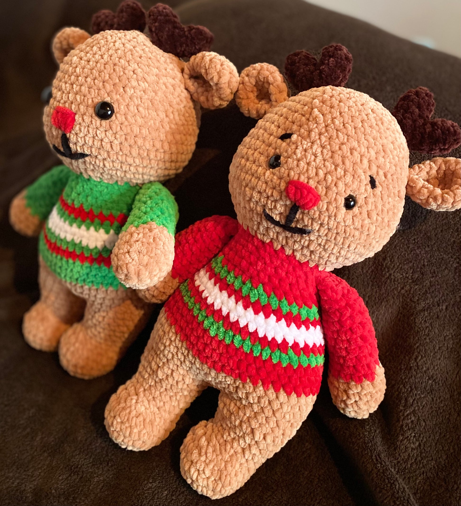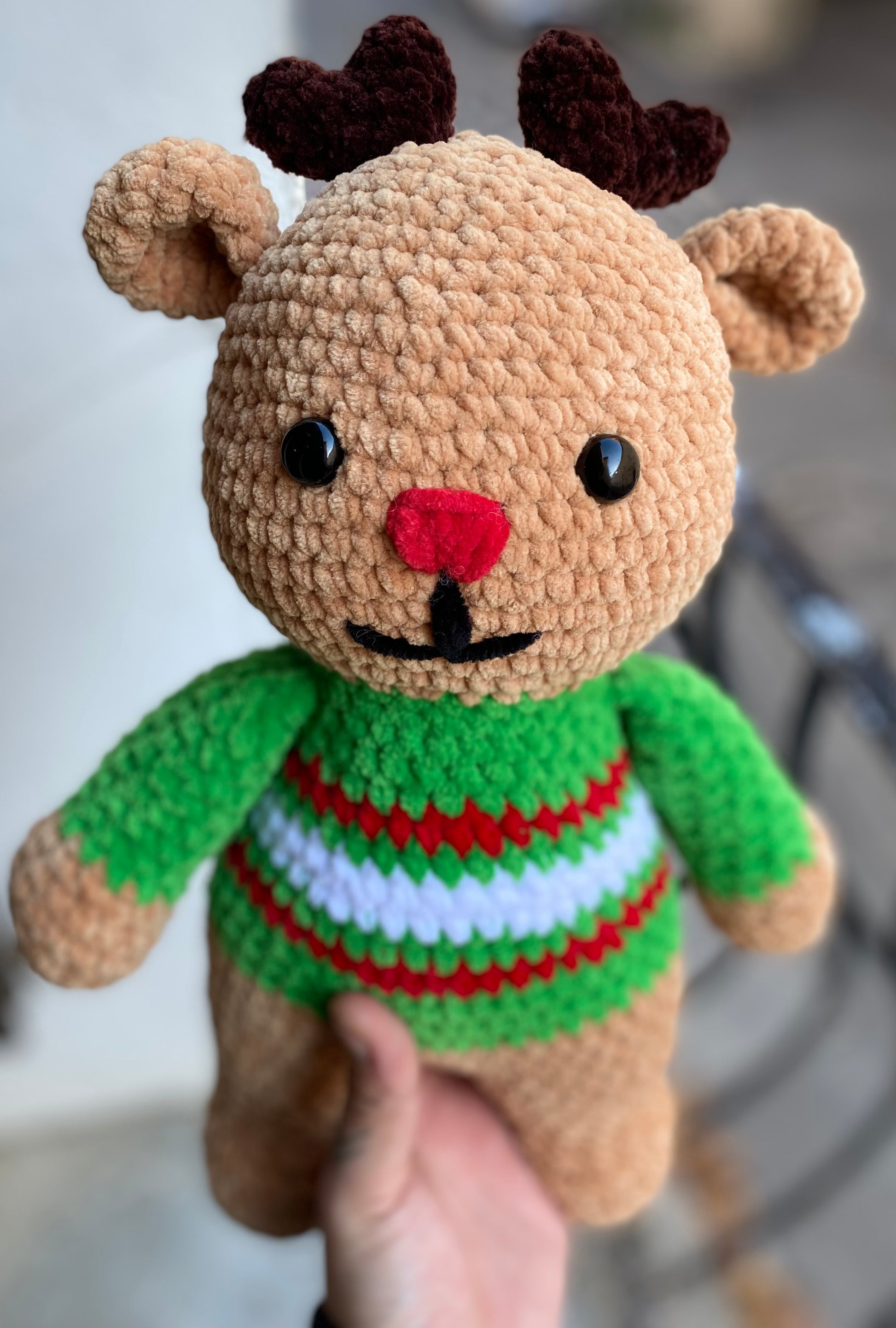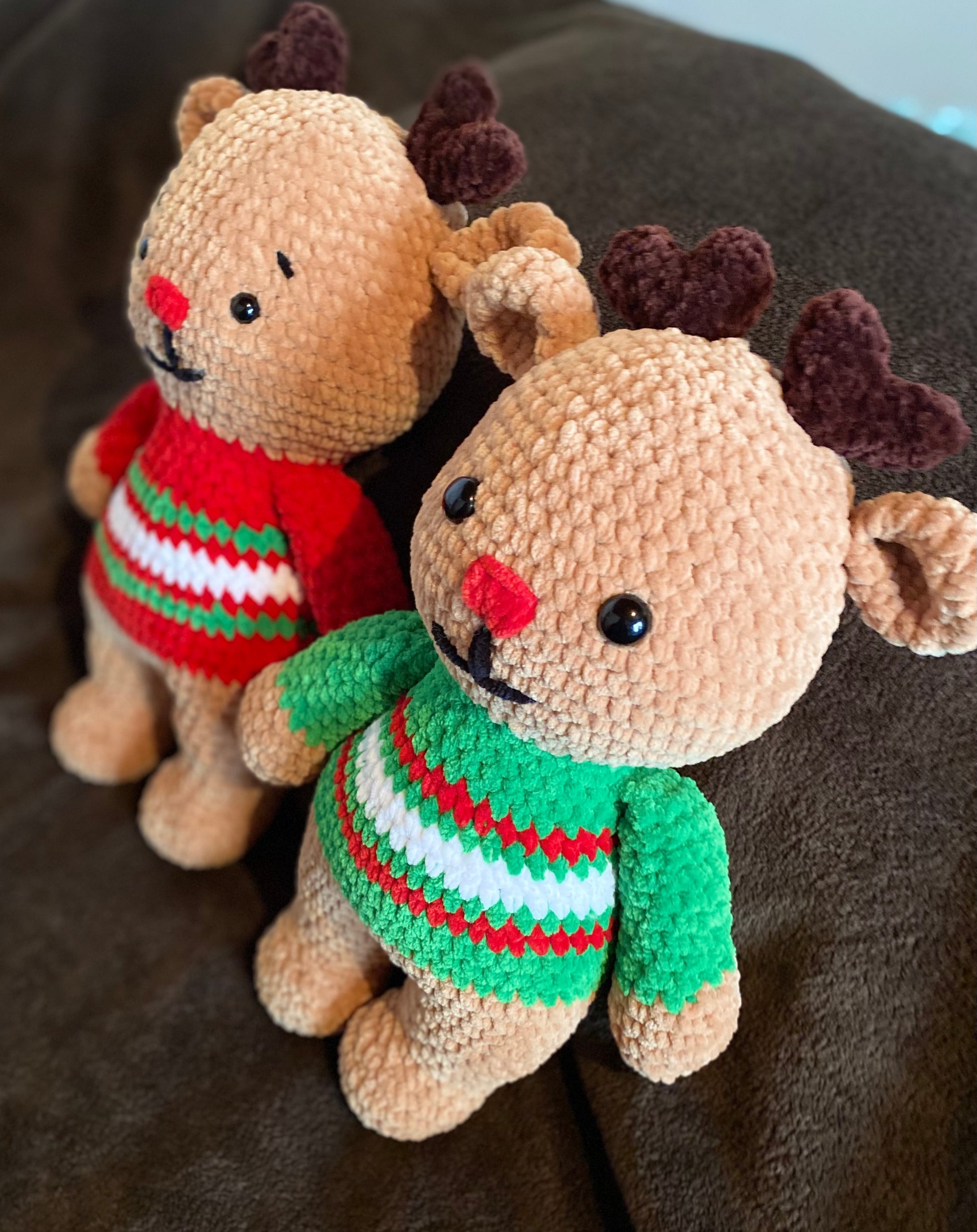 Crocheté à la main avec soin, ce petit renne tout mignon, avec ses bois tout doux et son air malicieux, est prêt à tirer ton traîneau de câlins. Idéal pour une déco chaleureuse ou un cadeau magique sous le sapin ! 🎄